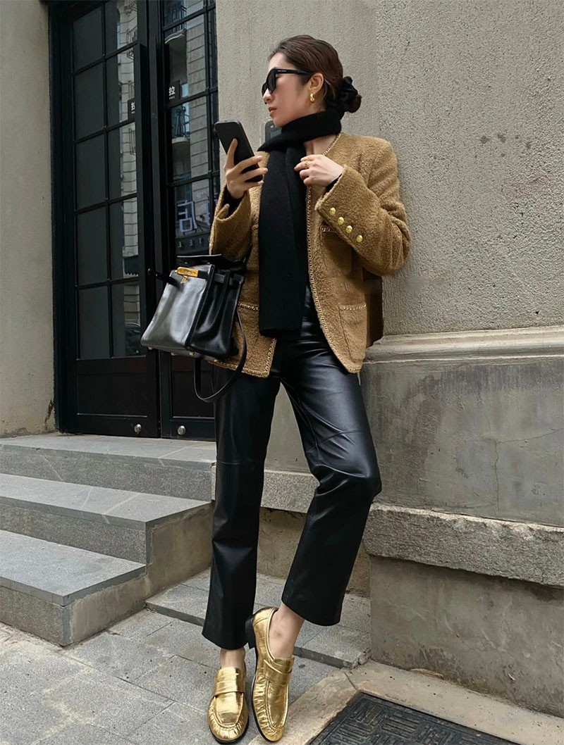 可以利用金色的包包、鞋履来匹配黑色“液体裤”,甚至只是佩戴金色的耳环,也能让整体的精致感提升,洋气升级。