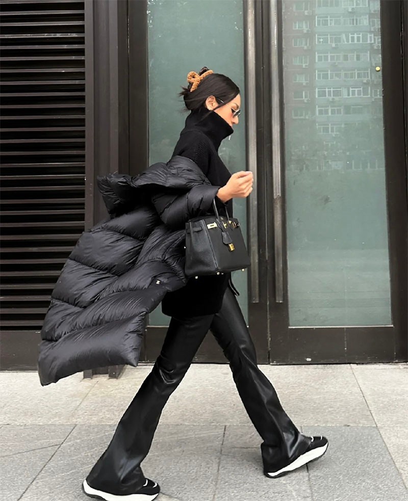 时尚icon们会利用黑色的明暗变化,掌握黑色的多变性,将不同面料的黑色组合在一起,展现出不同的黑色视觉感,原本的沉闷感也就一扫而空。