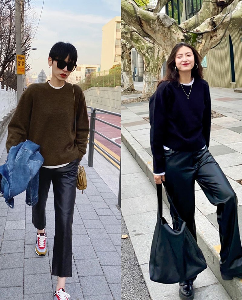 直筒型液体裤对腿型的修饰功能很强大,视觉呈现出笔直的双腿。上衣若是宽松的毛衣,落肩袖结合廓形,则要注意高腰线不能被隐藏,选择部分塞腰线的方法,显现出裤子的高腰部分,一样能显高显瘦。