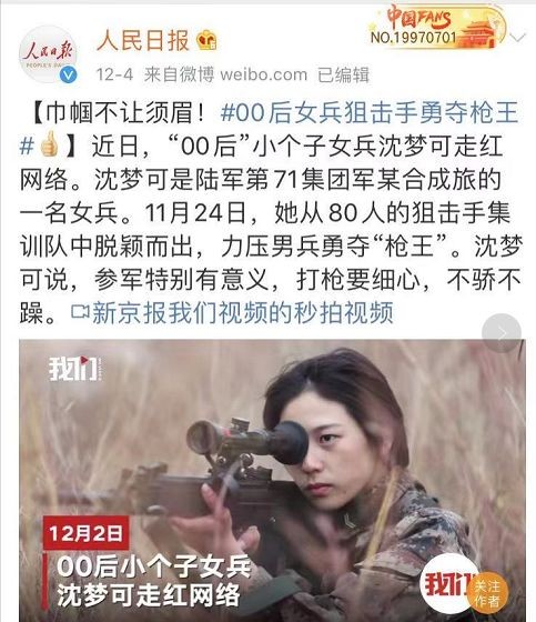 “00后”、女兵、上等兵、“狙击手冠军”……小姐姐不仅实力爆棚,一头利落的短发,英姿飒爽,颜值超高,一下子戳中了大家的心。人民日报、央视纷纷转发。