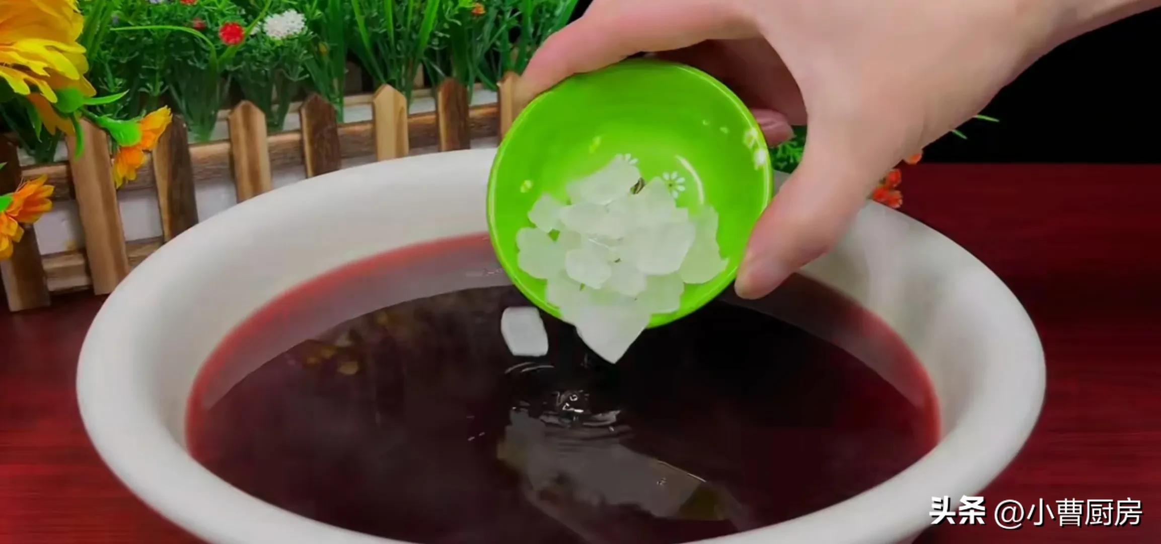 接着先将熬好的酸梅汤倒出来倒入一个干净的大盆里,哇好香啊、满屋子都是酸梅汤的味道,接着趁热再往里面加入适量的冰糖增加甜度,然后用勺子将冰糖搅拌至完全融化,先放在一边冷却放凉。