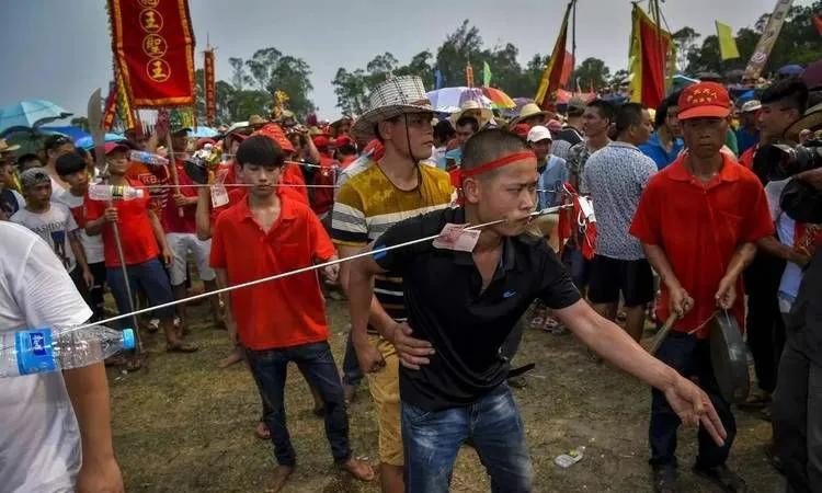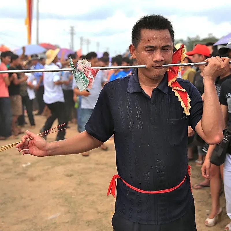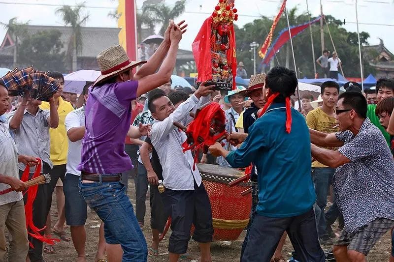 每个村寨都有各自的代表(乩童),上完香后时辰一到便开始敲锣打鼓,众人喝彩,等待附体。