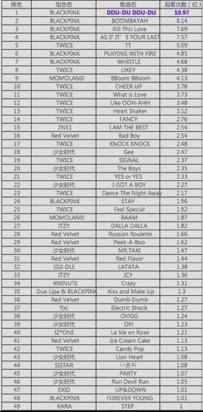 第一名:BLACKPINK,第二名:TWICE,第三名:少女时代,第四名:Red Velvet,第五名:MOMOLAND,第六名:ITZY,第七名:2NE1;第八名:(G)I-DLE;第九名:4MINUTE;第十名:f(x);第十一名:IZ*ONE;第十二名:SISTAR;第十三名:EXID;第十四名:KARA。(排名依据:YouTube破亿MV合计观看次数,数据统计日期:2020年3月20日)