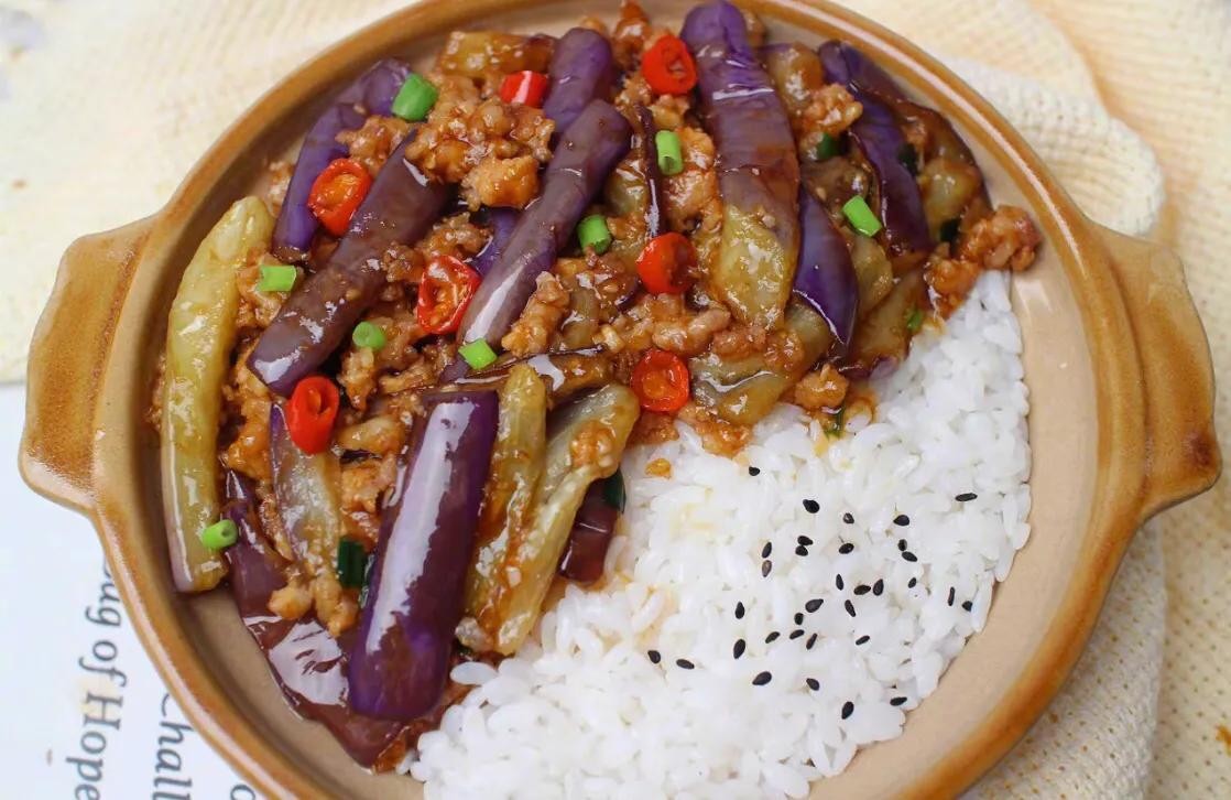 5.锅中留底油,放入肉末炒变色,放入葱花、蒜末、小米椒煸香,再倒入茄子和酱汁煮至汤汁浓稠,倒在米饭上即可。