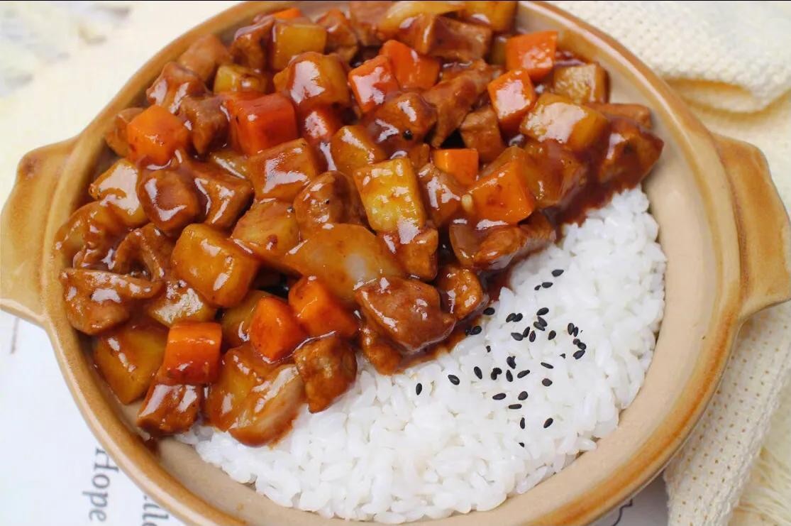4.锅中留底油,倒入洋土豆胡萝卜丁炒至微焦,再放入洋葱炒香,倒入牛肉,加入酱汁炒至浓稠、倒在米饭上就OK啦!