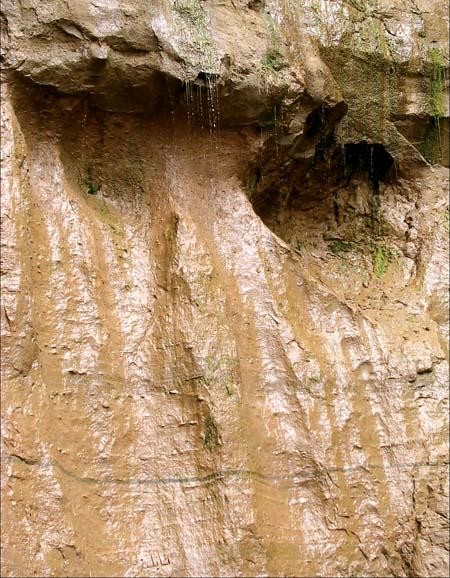 走出慕士山区,泪泉就不得不去了。泪泉位于策勒县南部伊玛木玛合得村,阿希河支流右岸阶地上。泪泉成因属扇缘溢出,以众多小泉水的形式出露,汇流成小溪。泉水清沏透明,流量约0.3米/秒。当地人视为圣泉,泉水在红色岩层上冲刷切割出一条宽约12米,深达20余米的红色峡谷,远观似几能红色瀑布,十分壮丽。由于泉水滋润,在沟旁边生长几颗古杨树,高约30-40米,直径1.6米,周长14.2米。泪泉周围为冲洪积扇倾斜平原,泉水在砾石层下流出,水文化变化与昆仑山前降水多少关系密切,可大可小。泪泉被本地村民视为圣泉,即是朝拜之地,又是饮用自来水,还有灌溉农田之功能。泉水被村民利用,这里交通比较便利,景致优美。与周边的沙漠戈壁相比,这儿真是一处人间仙境,超凡脱俗。