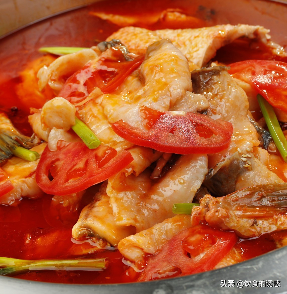 锅内放入自炼油 150 克,烧至五 成热时,下入小料(葱末 30 克,香葱 末 10 克,姜末、蒜末各 20 克)中火 炒香,倒入罐装番茄酱 300 克,中火 炒至油色变红,再下入番茄蓉,小火 煸炒 1 分钟,倒入番茄块,中火炒至 番茄块碎掉,倒入清水 1200 克、鱼头、 鱼骨和调料(白醋 50 克、白糖 80 克、 盐 25 克、鸡精 20 克、味精 10 克、 白胡椒粉 3 克),大火烧开,改小火 煮熟鱼头,将鱼头和鱼骨捞出,放入 容器内垫底。将鱼片分别下入锅内, 中火加热 1 分钟至鱼肉成熟,关火, 将鱼肉和汤汁倒入装有鱼骨的容器内, 撒入香葱段 5 克、红番茄片 50 克、 盐炒花生碎 30 克,即可上桌。