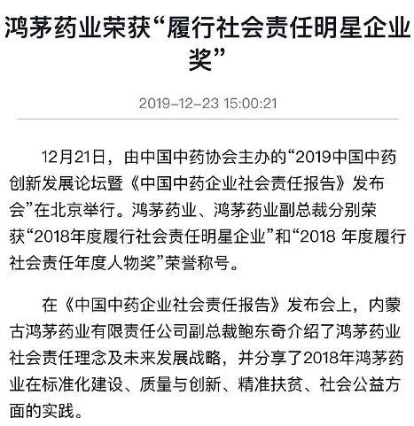 中国中药协会授予鸿茅药业上述荣誉称号。