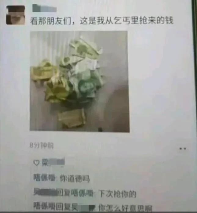 抢人的那个晒出抢来的零钱,得意炫耀:看哪朋友们,这是我从乞丐那里抢来的钱。