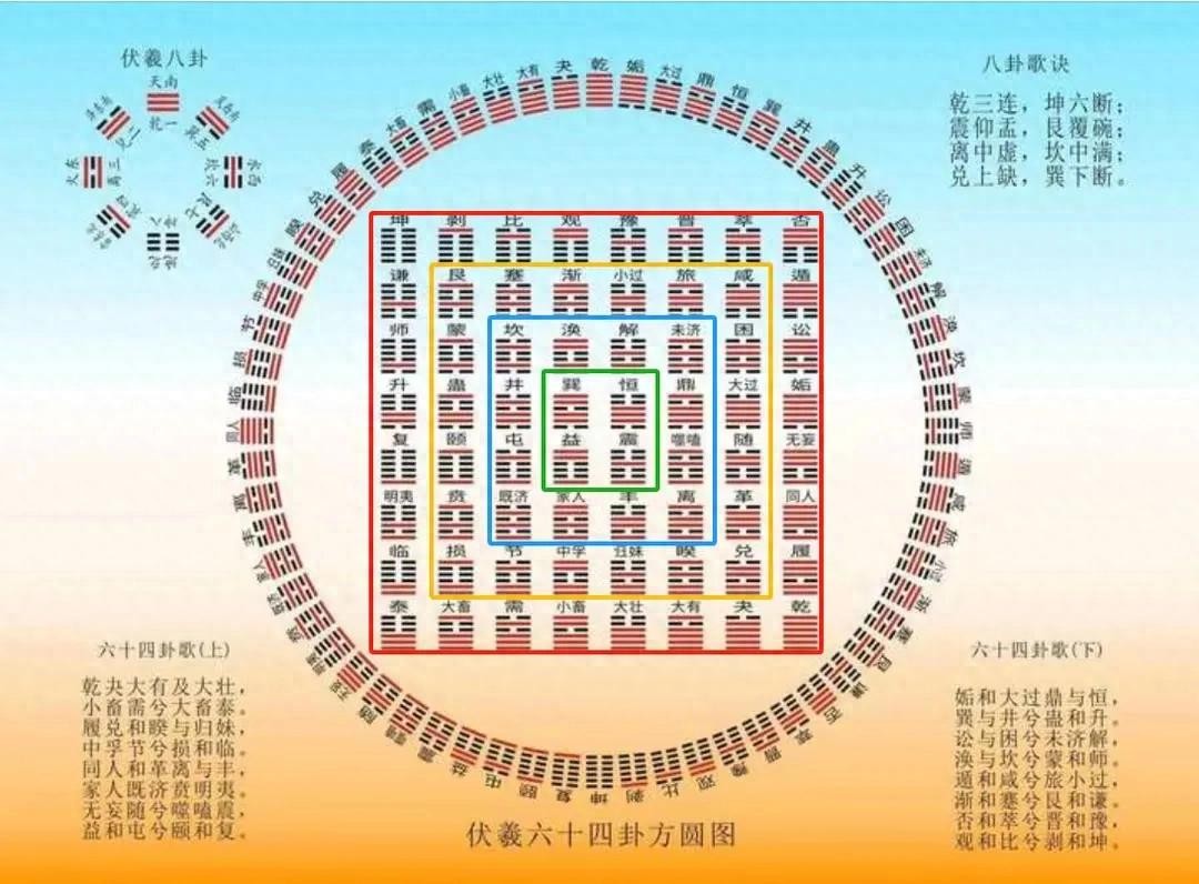 天道左旋,左半圆,按先天八的图的排序,方图中的第一横行,按乾、夬,大有、大壮、小畜、需、大畜、泰的顺序从上至下排列于左上方;泰卦接第二横行履、兑、睽、归妹、中孚、节、损、临;依次接第三横行的同人至明夷;明夷卦后,接第四横行的无妄至复卦,完成了圆图的左半圈。地道右转,右半圈,按先天八卦图的排序,乾卦右方从上至下排第五横行姤、大过、鼎、xun、井、蛊、升卦;升接第六横行“讼至师”;师接第七横行的“遁至谦”;谦接第八横行的否、萃、晋、豫、观、比、剥、坤,形成右半圈,左右半圆合二为一,为六十四卦的圆图,该圆图是始于乾终于坤的天道轮回、反复无穷,永不停息的状态。