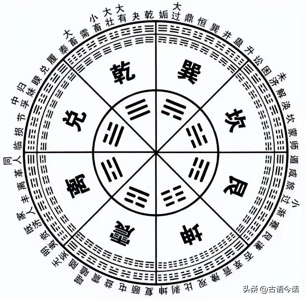 朱熹说:“圆图其阳在南,其阴在北;方图其阳在北,其阴在南。”后天八卦的天无上,地无下便源于此。方圆图中,圆为天道,方为地道,天地间为人道。此二者阴阳对待之数即天地,阴阳在图中相交。