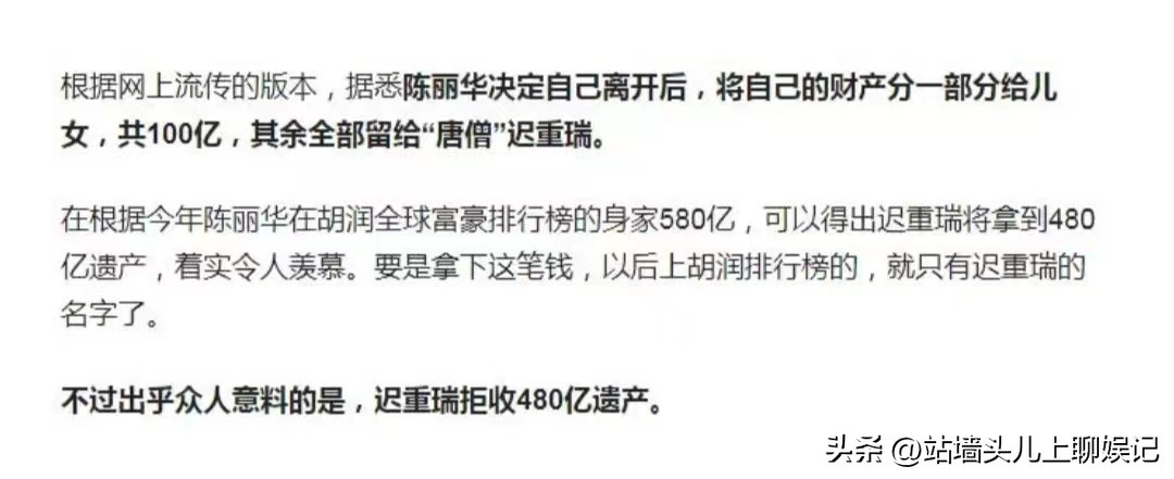网上关于陈丽华立遗嘱的消息传的沸沸扬扬,最广为流传的一个版本就是,四个儿女各100亿,剩下的全部留给迟重瑞。
