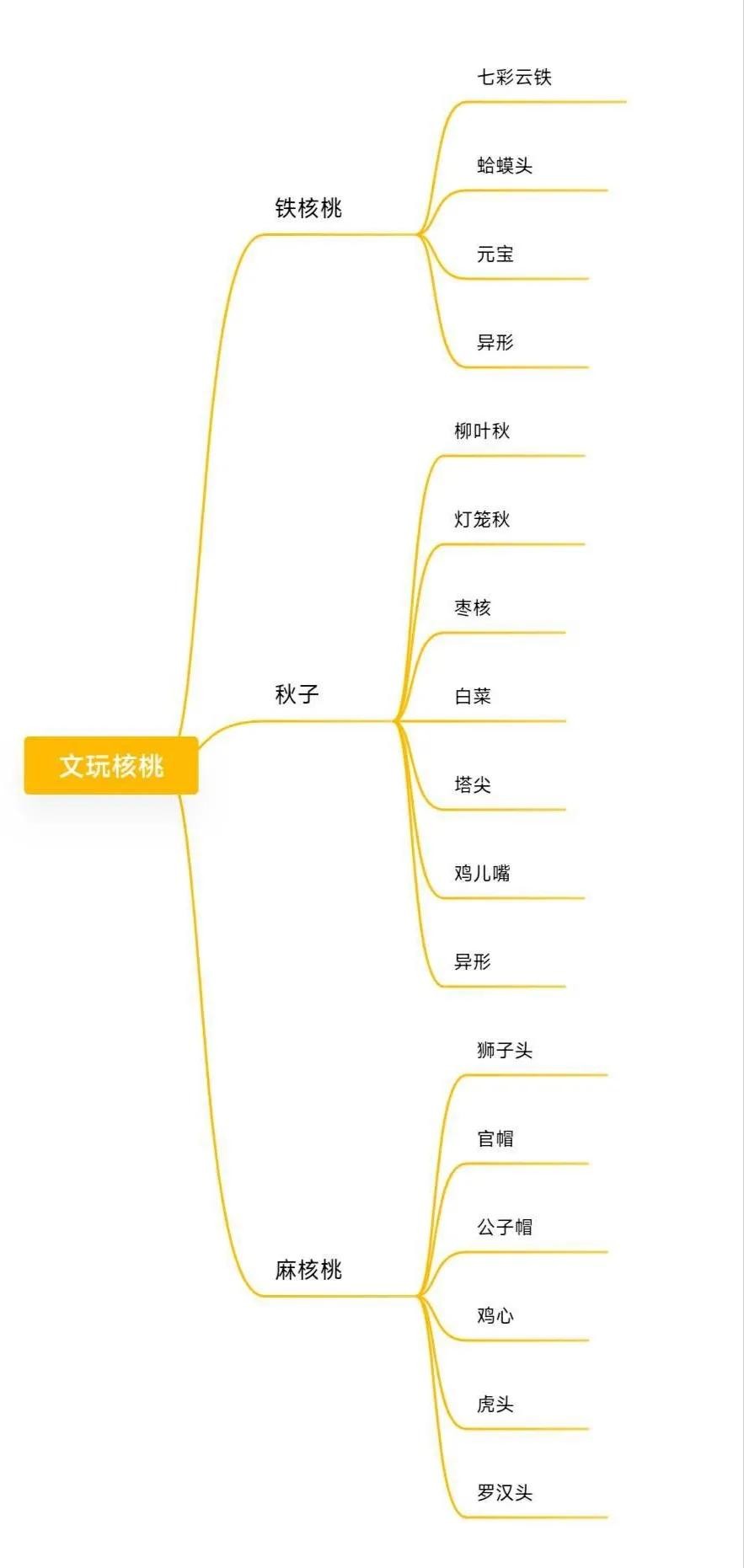 今天我们来聊一聊文玩核桃的分类,一般我们说的文玩核桃可以分为铁核桃、秋子、麻核桃这三个大类。而在这三大类中我们又做了一些细分。如下图:
