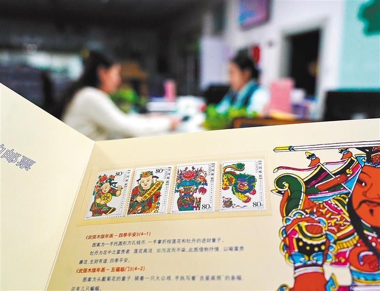 ◀2024年12月25日,在武强县一家邮政网点拍摄的武强木版年画邮票。2006年,由武强木版年画制成的带邮资特种邮票面向全国发行。