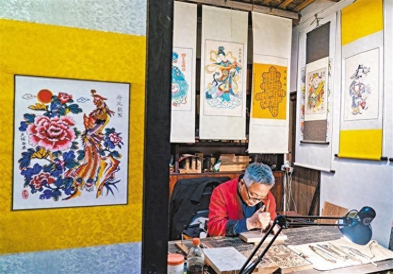 ◀2024年12月24日,国家级非物质文化遗产武强木版年画代表性传承人马习钦在工作室为年画刻版。