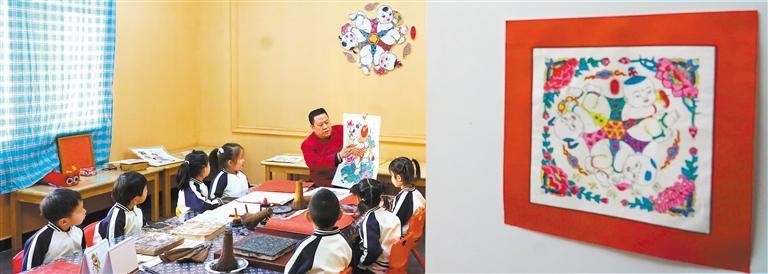 2024年12月24日,武强县府兴幼儿园年画小屋,武强木版年画省级代表性传承人康英勤(中)为小朋友讲述年画故事。