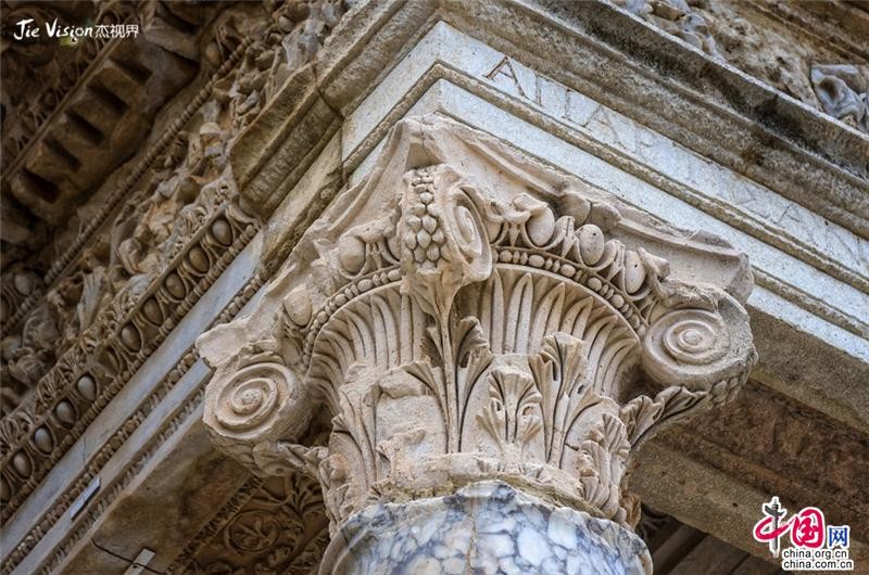 图书馆由一座上下两层的大理石建筑组成,它的宏伟和壮丽使人感到深深的震撼,据说是当时艾菲斯的罗马总督切尔所死后,他儿子为纪念他而建的。图书馆的正面犹如一幢宫殿,门前共有16根大石柱,石柱的上下有精美的雕刻。