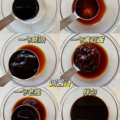 2、第二步:调酱汁:一勺生抽➕一勺老抽➕一勺料酒➕一勺蚝油➕一勺黄豆酱拌匀
