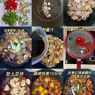 3、起锅烧油,放冰糖小火慢炒出糖色,注意别烧糊,可关火后放入鸡块翻炒均匀,放入干辣椒段、八角、香叶、葱段、姜片、蒜片,然后开火翻炒,鸡块上色后倒入调好的酱汁炒匀,加两碗热水没过鸡块,盖盖焖煮15分钟,然后加入切滚刀块的土豆,翻匀继续煮10分钟左右,土豆和鸡块软烂后加入青红辣椒块,翻炒2分钟,撒葱花出锅。