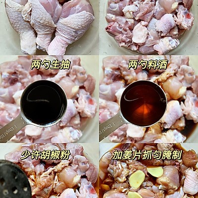 1、鸡腿剁小块,多次泡洗出血水,洗净后放碗中➕两勺生抽➕两勺料酒➕少许胡椒粉➕姜片腌制20分钟