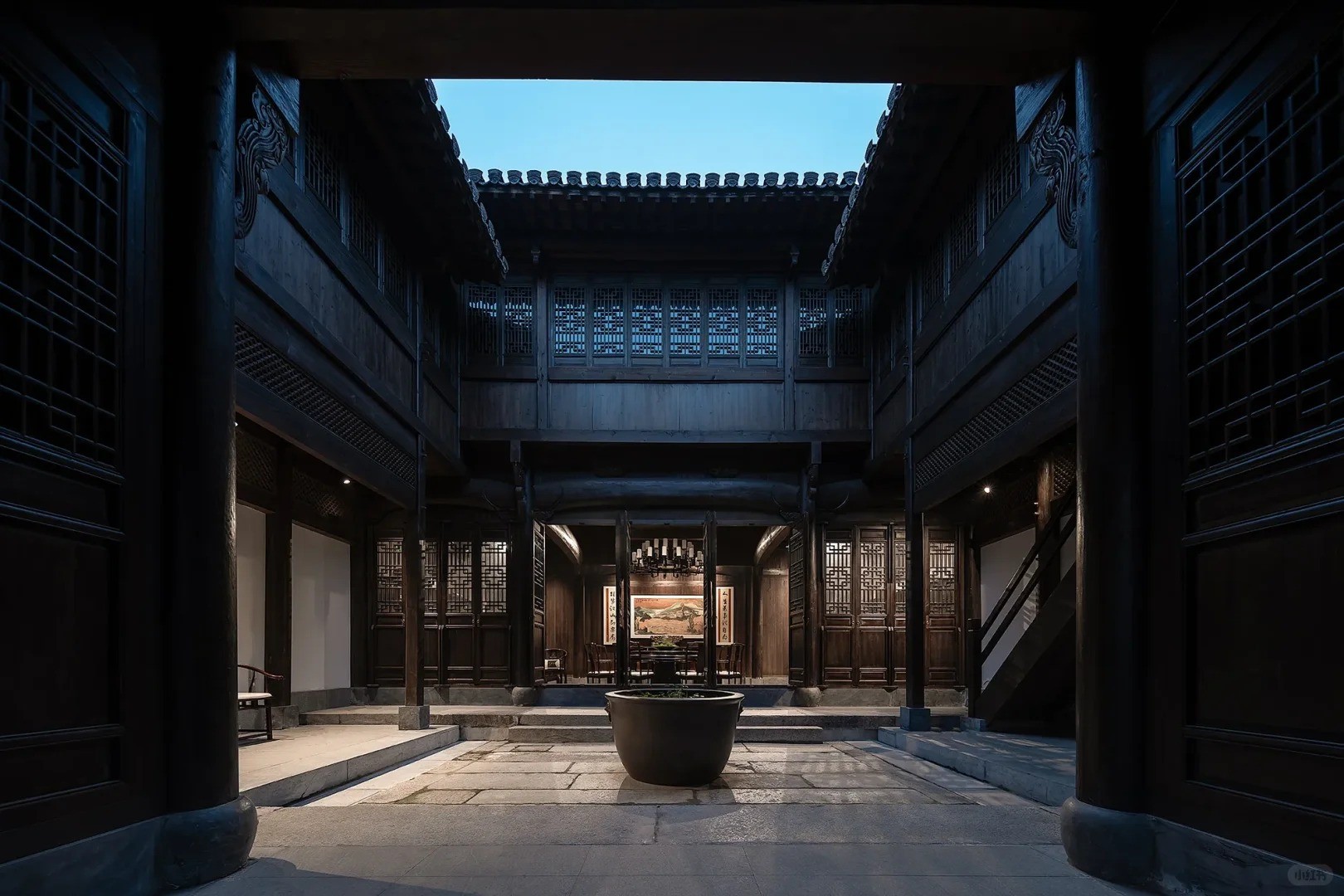 天井是全家活动的核心:老人晒太阳,孩子追蜻蜓,主妇晾衣被。四面的屋檐围成“口”字,家人无论在哪,抬眼就能相望。一院温情,全藏在四水归堂的方寸之间。