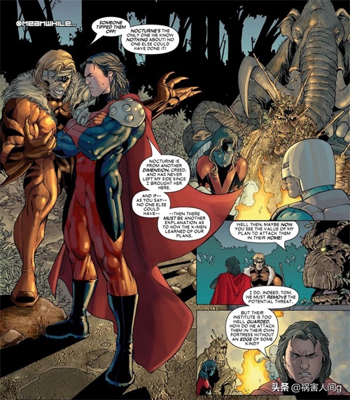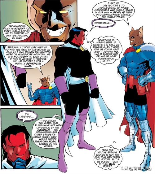 在会议上出谷经常与凶兆先生发生冲突,因为出谷非常鄙视凶兆先生。这里其实是有原因的,上文就提到过,出谷认为人造的变种人、异人族等都是不洁的,还要毁灭他们。凶兆先生原本并非变种人,尽管他进入过天启的十二骑士,他是被天启改造的人类,获得能力之后他也不断地在改进自己的基因。