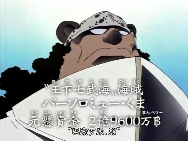 2.巴索罗米·熊,外号暴君,原悬赏金2亿9600万贝利,肉球果实能力者。第一次登场是在克罗克达尔被路飞打败的时候,海军召开会议时登场,从头到尾都没说话。第二次登场在恐怖三桅帆船-莫利亚篇,接到世界政府命令来到莫利亚岛上,看着莫利亚被打败并汇报给世界政府。而后帮扶路飞消除疲劳,又考验了索隆的意志,瞒报结果,最终没有完全抹杀草帽一伙,还感慨真不愧是自己首领的儿子。