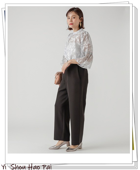 灰色碎花上衣散发出一种透明的魅力感觉,通过黑色锥形裤别致地组合在一起。银色高跟鞋发出高品质的感觉,完成了高贵优雅的造型。