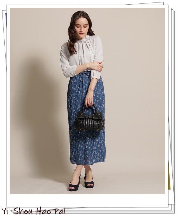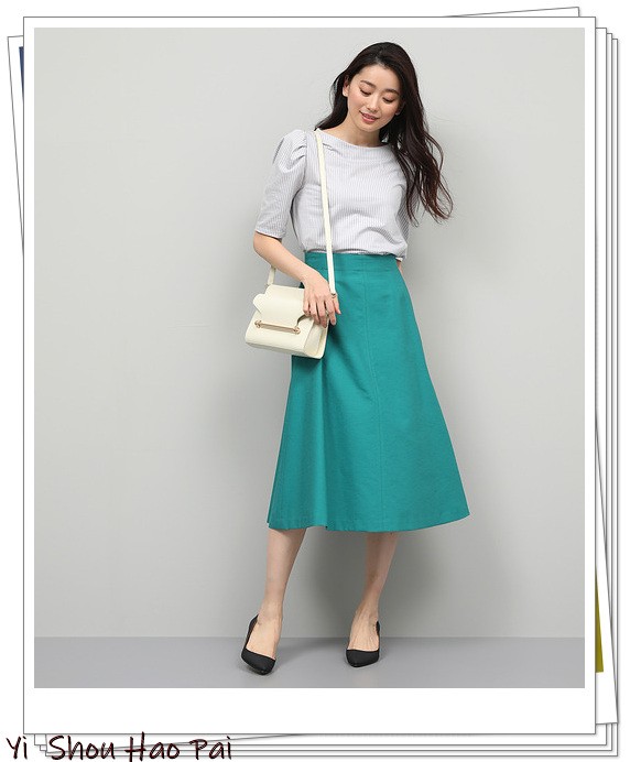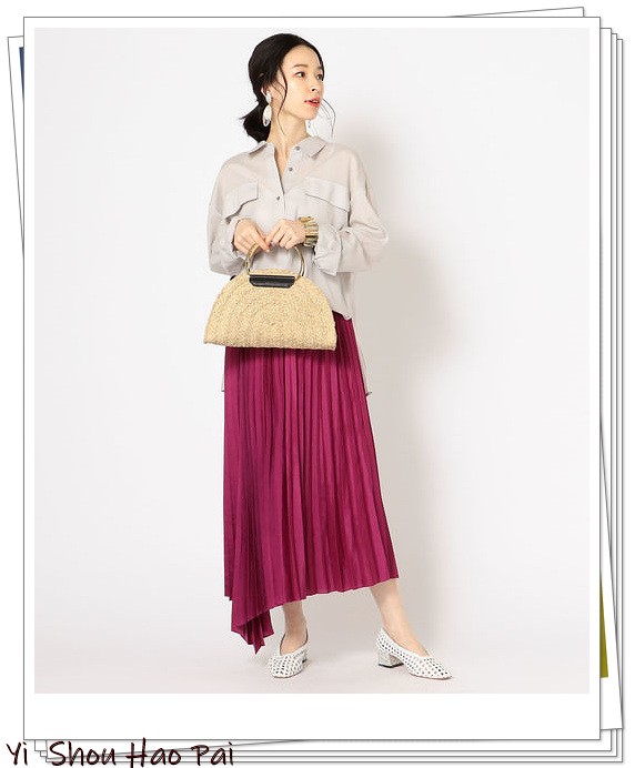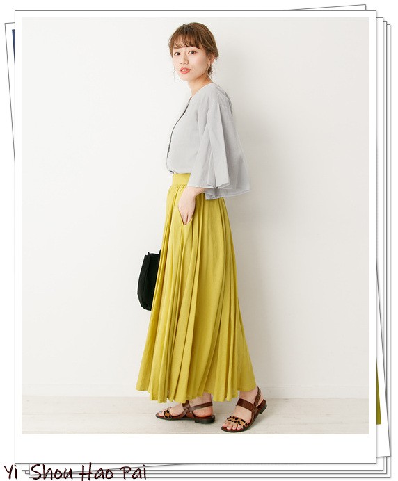 浅灰色衬衫和长裙的结合可能灰给人以沉重的印象,因此,推荐时尚的黄色长裙。黄色与浅灰色的搭配非常出色,还可以营造出夏季清新华丽感!