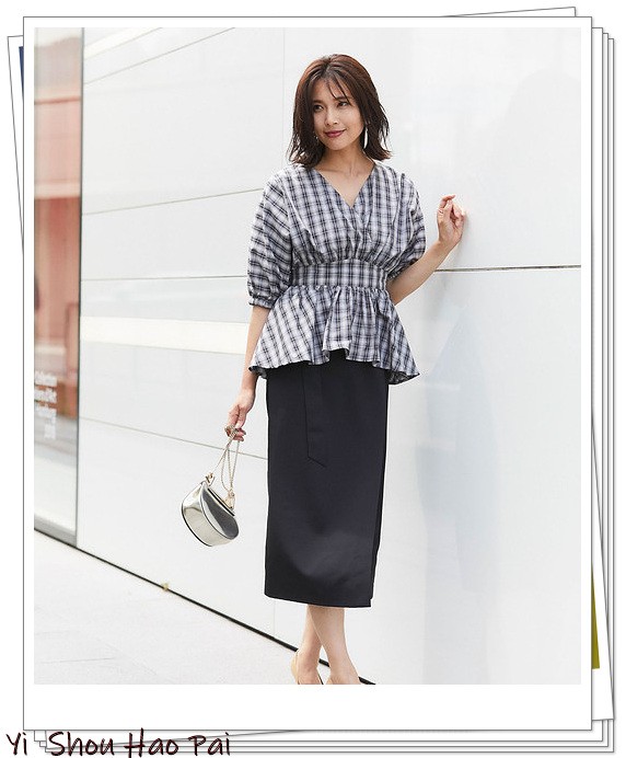 格纹图案的蝙蝠袖收腰上衣,既时髦又带有强烈的女性气息。搭配黑色紧身裙,很完美。