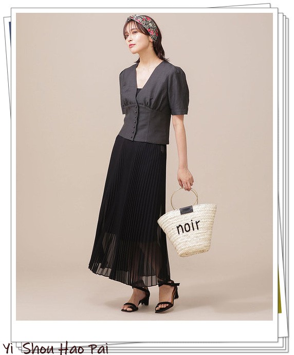 在深灰色×黑色的别致配色方案中,选择连衣裙和V领的上衣搭配是一种时髦的造型。使用鲜艳的头巾作为配饰,可以有效地提升重心,并起到画龙点睛的作用。
