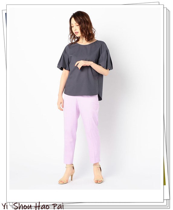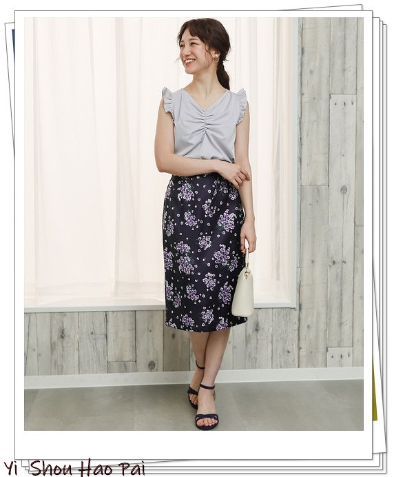 飞飞袖设计的灰色衬衫,散发女性魅力。如果搭配紫色的花朵紧身裙,散发出高贵的魅力,你将完成带有成熟感的夏日搭配。