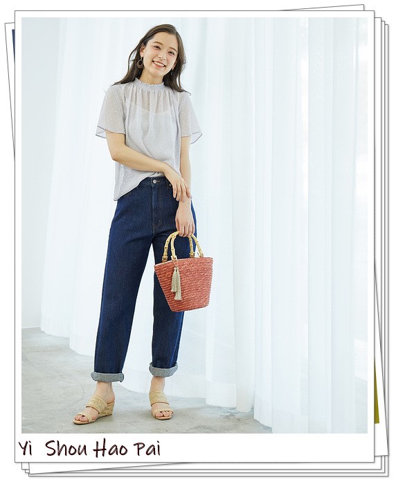 通过选择透明材料,灰色会给人以淡淡的舒适甜美印象。喇叭袖上衣搭配牛仔裤和篮子包,完成精致的女性休闲装。