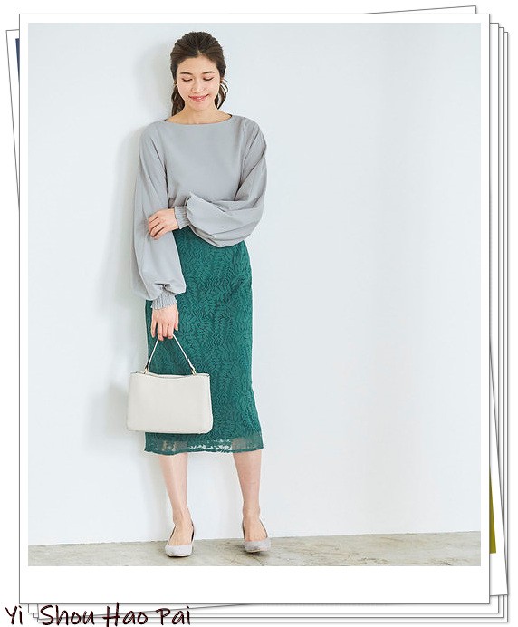 还建议将绿色作为与浅灰色搭配的颜色。灰色泡泡袖上衣搭配绿色蕾丝半身裙散发出优雅气息,给人一种轻松的成熟感。