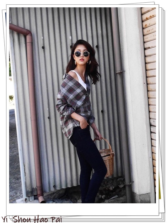 格伦格纹衬衫带通过露出肩膀的方式来完成时尚造型。搭配黑色紧身裤即可显得平衡而时尚,而提篮包则给人带来一股巴黎风情。