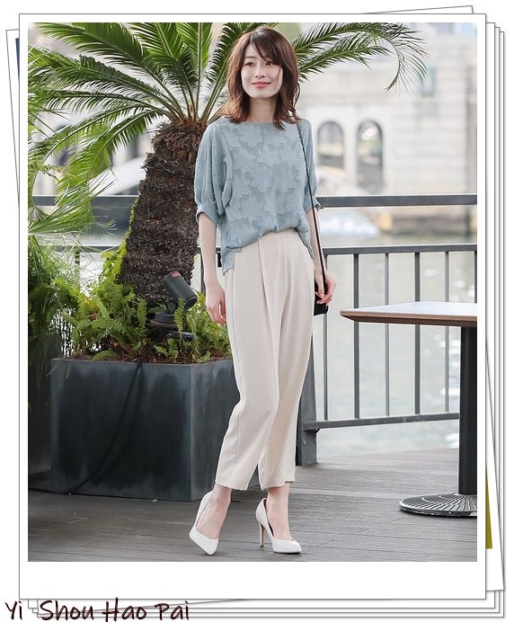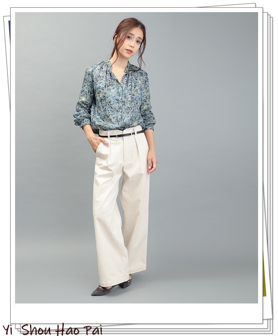 女性化的花卉印花衬衫具有柔和的蓝灰色,显得甜美。搭配浅米色的锥形长裤,显得很时髦。