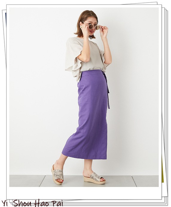 带有大喇叭袖的灰色上衣给人以甜美的女人味,通过搭配紫色长裙来创建具有光泽感的夏日造型。