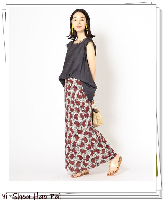 花卉长裙搭配女性化的浅灰色上衣,展现出一个知性的女人。选择黑色的篮子包,时尚轻熟的穿搭。