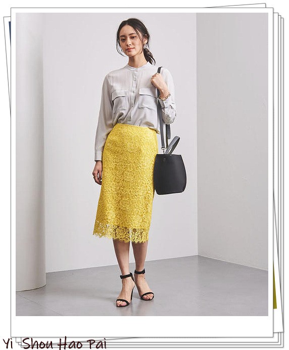 经典的浅灰色衬衫搭配黄色蕾丝半身裙,显得新鲜的夏季造型。在发出明亮的华丽光泽感的同时,黑色配件将整个造型巧妙地收紧。