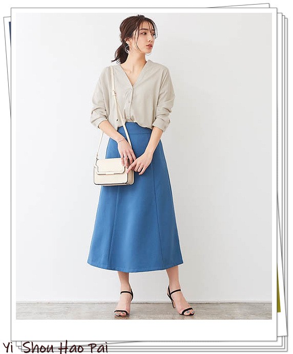 如果你想要漂亮的造型,建议使用浅灰色的V领上衣来搭配一条蓝色的喇叭裙,感受优雅和知性的品味。