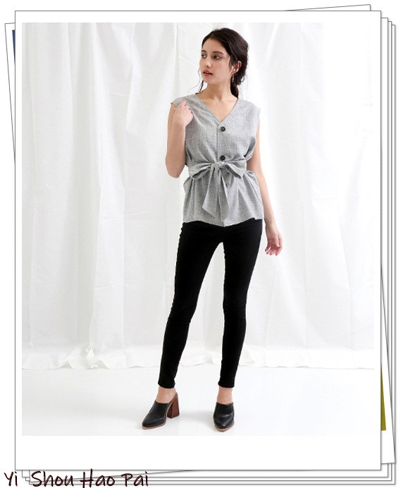 灰色上衣带有V领,使脸部显得清晰。腰部的系带为造型增添了女性味,同时让你的紧身裤造型带有清凉感觉。