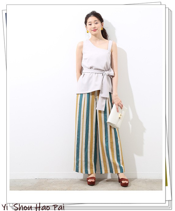 灰色上衣可以通过结合条纹阔腿裤来达到腿长的效果。本季流行的单肩上衣搭配彩色条纹阔腿裤,可以实现非常新潮造型。