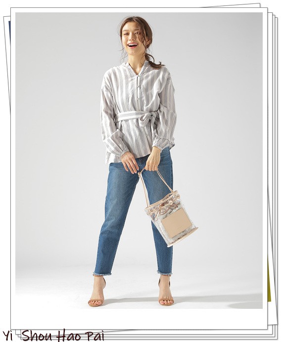 如果结合了条纹图案,则简单的灰色衬衫和牛仔裤造型可以升华为夏季的清新造型。使用透明的PVC袋增添时尚感。