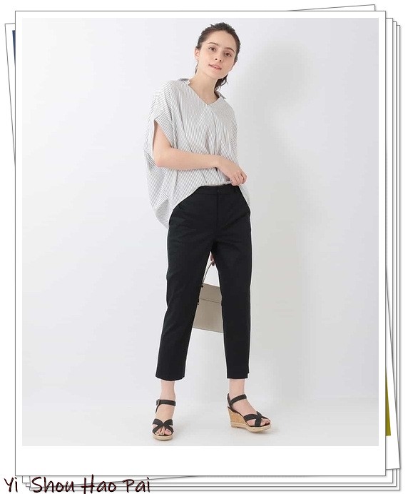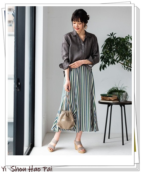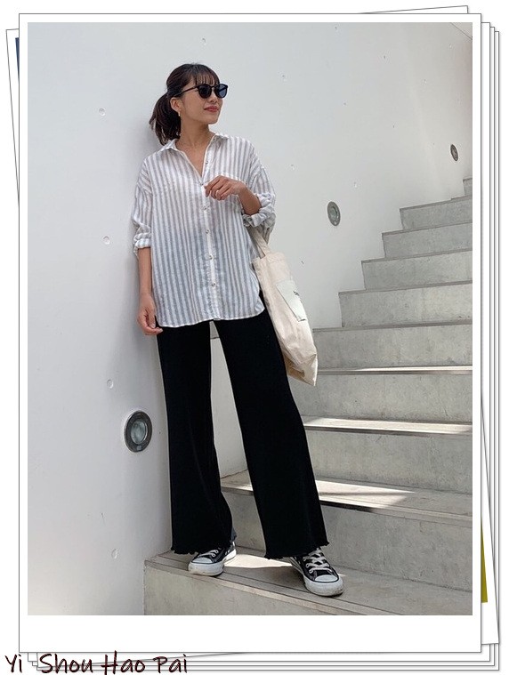 当你选择深灰色时,清爽的亚麻衬衫可以营造出成熟的穿搭感。用灰色上衣x蓝色条纹阔腿裤来完成优雅自然的搭配。
