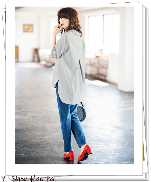 那些担心腰部的女人,可以穿灰色长款衬衫。让我们一起搭配漂亮的牛仔裤吧。红色高跟鞋完成了心情愉快时的搭配。
