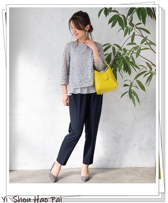 浅灰色蕾丝衬衫,通过搭配黑色锥形小脚裤来降低它的甜美感觉。时髦的黄色升华了基本的颜色造型。