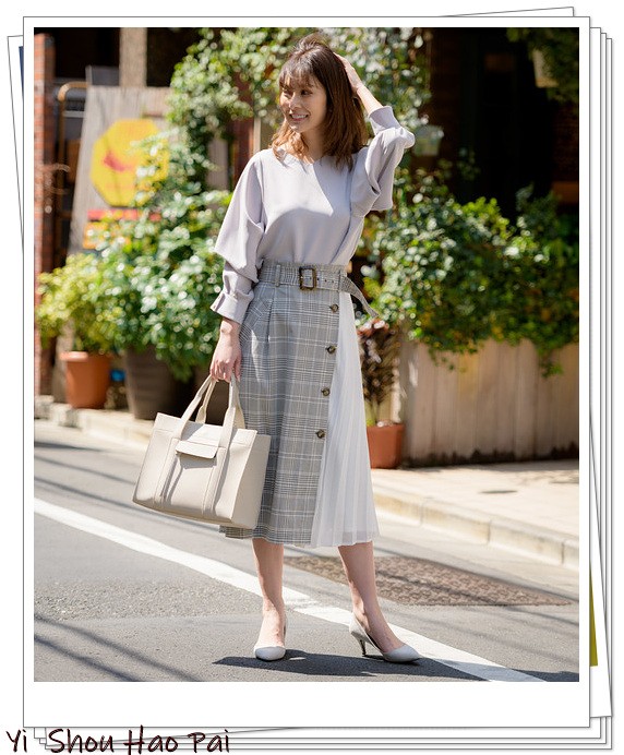 灰色上衣搭配灰色格子和百褶拼接半身裙裙。简单的喇叭轮廓,但独特的设计让造型显得时髦。