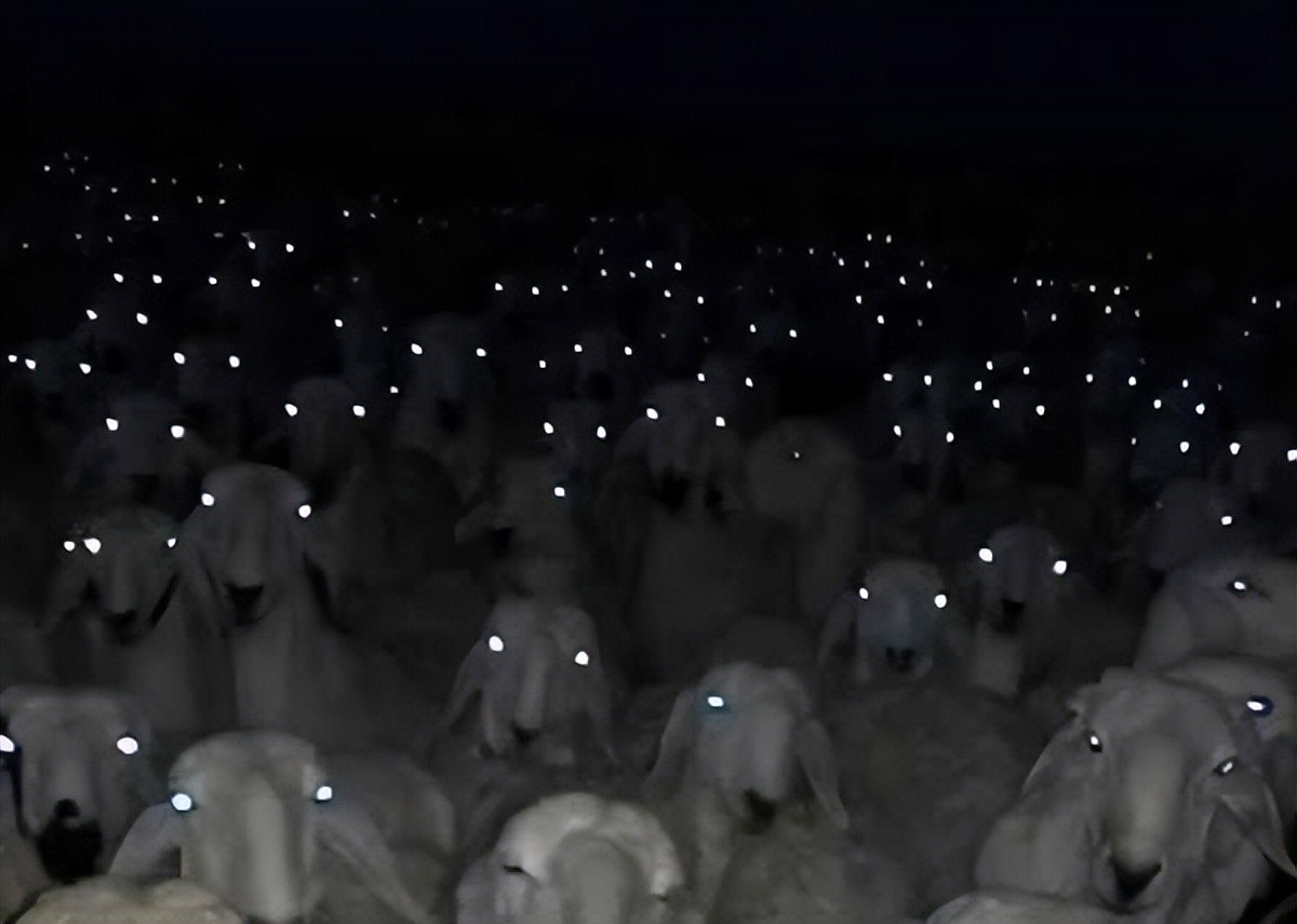 绵羊是非常可爱的动物,但是你尝试在晚上用相机上的闪光灯给它们拍照,迎接你的将是一双双威胁、可怕的眼睛,在漆黑的夜色中注视着你,如果不是前面那只羊有些辨识度,这个画面简直无法解释。