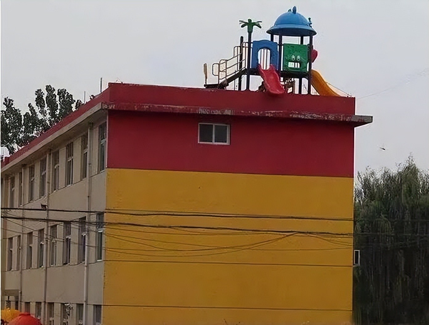 希望这个游乐场只是恶作剧,地球上肯定没有人愿意冒死亡的风险去玩它。游乐场的两个滑梯都直接从建筑物的屋顶伸出。为什么会有人把设置放在那里……他们是怎么设法把它放在那里的?