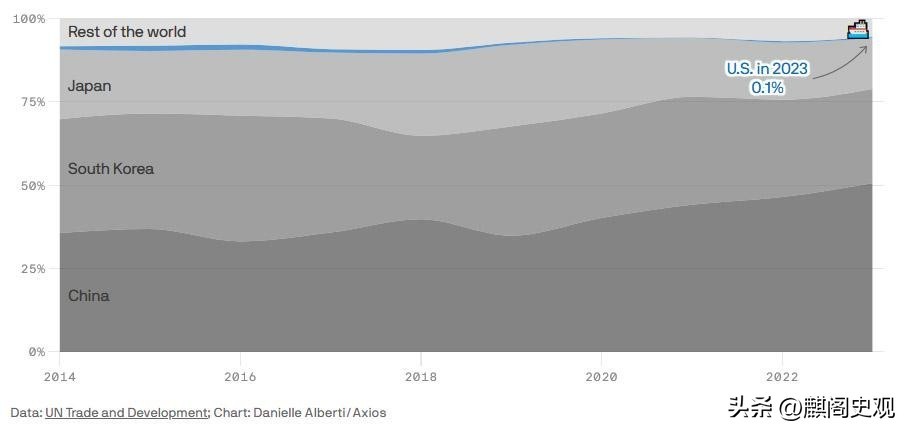 与美国不同的是,中国造船能力要远超美国,在商用船只和军舰上都有明显的优势,到了2023年中国已经占据了全球海上运输量的40%,而美国却仅有0.1%。